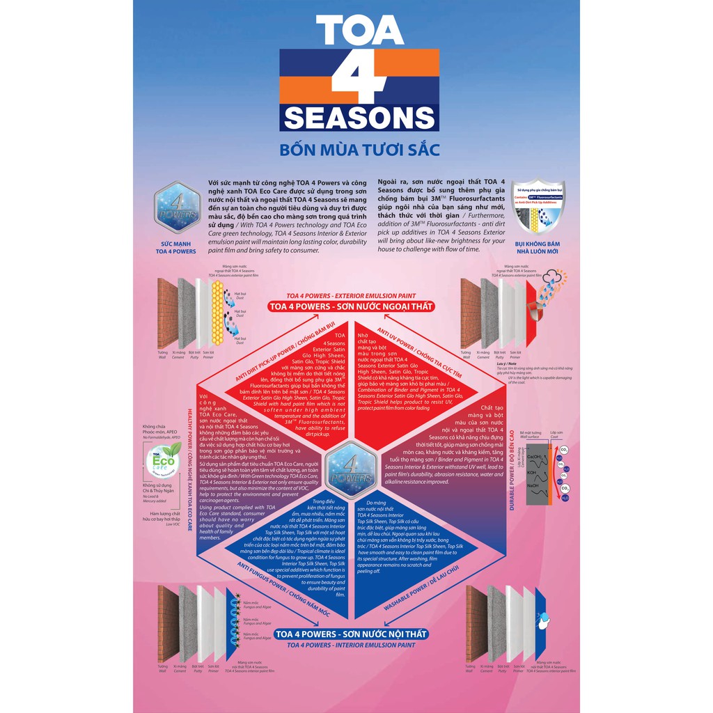 Sơn nước ngoại thất TOA 4 Seasons Bóng Mờ là sơn nước dành cho ngoài trời, được sản xuất từ nhựa nhũ tương Acrylic với các ưu điểm: chống phai màu gấp 2 lần, khả năng bảo vệ lên đến 5 năm, màng sơn bóng mờ với độ phủ cao, khả năng chống chịu thời tiết khắc nghiệt: chống bám bụi, chống phấn hóa, chống rong rêu nấm mốc, công thức không chứa chì, thủy ngân, phooc-môn, hàm lượng VOC thấp. Ngoài ra, phụ gia chống bám bụi 3MTM Fluorosurfactants giúp màng sơn sáng đẹp theo thời gian.Việc cho ra mắt công nghệ 3MTM là sự kiện quan trọng đánh dấu sự thành công của Sơn TOA Việt Nam trong việc ứng dụng những công nghệ tiên tiến & hiện đại nhất trong ngành công nghiệp