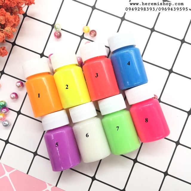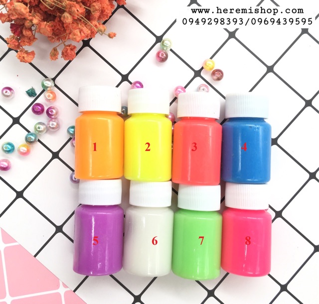 Màu phát quang pha resin bên mình hiện có 8 màu như ảnh ạ.Màu sau khi được hấp thụ ánh sáng sẽ phát sáng trong bóng tối.