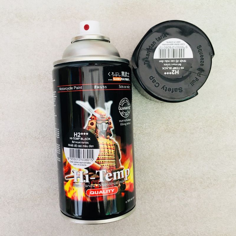 Chai sơn xịt pô Samurai có tên gọi là H1 và H2 trong đó chai H1 là màu bạc và chai H2 là màu đen nhám. Mua sơn chịu nhiệt để sơn pô xe máy ở đâu? Sơn pô xe máy chịu nhiệt lên đến 600 độ C (Màu đen nhám).