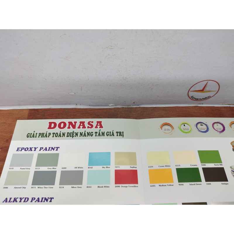 Mã màu Sơn epoxy Donasa: 3135 pastel grey ; 3086 almond chip;3113 grey blue ; 3071 whea ther vane; 5099 off white; 3114 silver grey; 8542 sky blue; 8541 buish white; 7073 sapling; 2098 orange vermillion; 6104 cream white; màu vàng 6105 medium yellow; 6113 creamy; 9046 island green; 9280 savin hill; 1044 antique