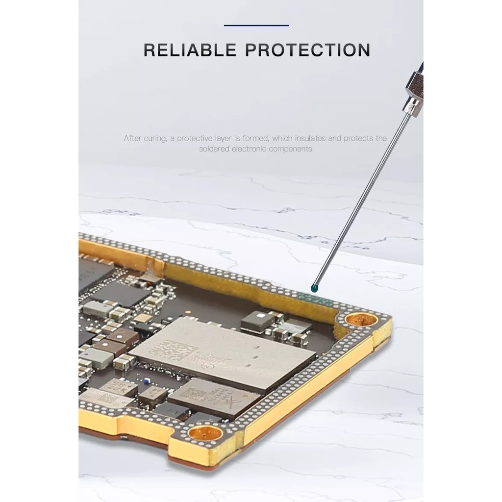 Keo xanh UV chuyên dùng cho anh em sửa chữa phần cứng chống lem mass, cố định dây câu. Keo UV được sử dụng để sửa chữa PCB sau khi hàn, làm lại, bảo vệ, ngăn ngừa bụi, độ ẩm và các yếu tố môi trường khác gây hư hỏng cách điện, chống ăn mòn, cách nhiệt, cách điện.