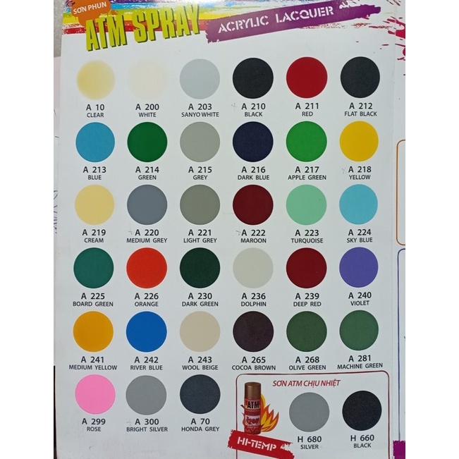 Sơn xịt ATM, Sơn phun đủ màu: bóng A10, Trắng A100, Đen A210, Đỏ A211, Đen mờ A212, Xanh lá A214, Xám A215, vàng A218…✅ Tên sản phẩm thường gọi: