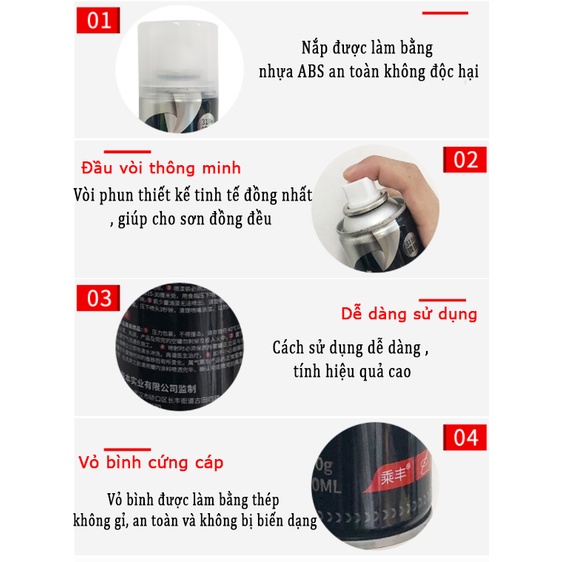 - Bình xịt màu inox có thiết kế nhỏ gọn 180gam. Thành phần sơn không chứa chất độc hại, an toàn cho người sử dụng.