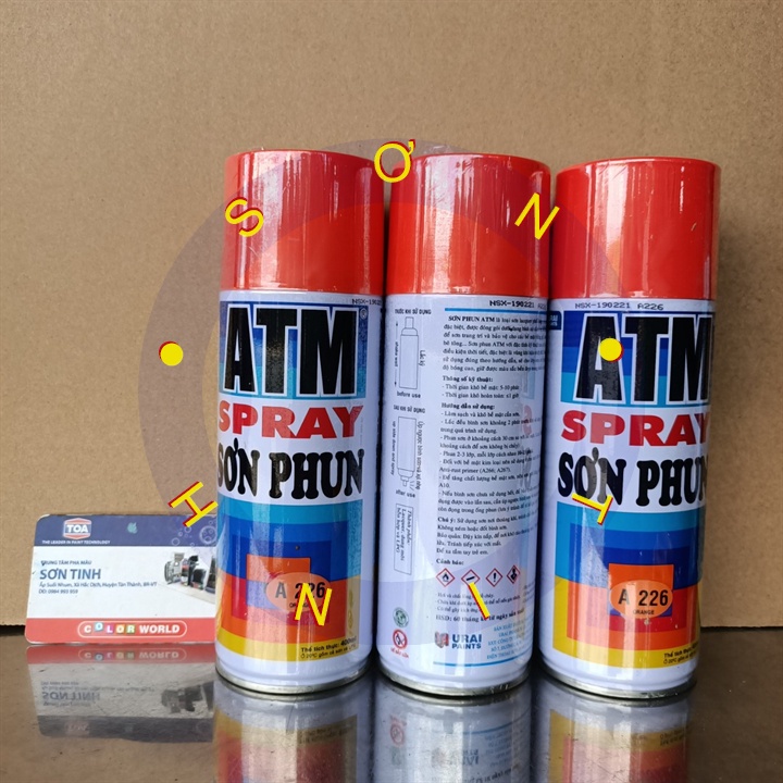 Sơn xịt màu cam ATM A226SƠN XỊT ATM SPRAY Được Đặc chế từ hỗn hợp nhựa N/C và ACRYLIC, được đóng gói dưới dạng bình xịt cầm tay rất tiện dụng, dùng sơn để trang trí cho các bề mặt bằng gỗ và kim loại như: đồ gia dụng, bàn, ghế, đồ chơi trẻ em, xe đạp, xe máy,... Với đặc tính kỹ thuật cao, thích hợp với mọi điều kiện thời tiết, đặc biệt là vùng khí hậu nhiệt đới. Trong điều kiện sử dụng đúng theo hướng dẫn, sẽ cho lớp sơn có độ bám dính tốt, độ bóng cao, giữ được màu sắc bền đẹp trong nhiều năm. Đây là loại sơn mau khô, chất lượng tuyệt hảo với màu sắc tươi, bền và bóng đẹp đến không ngờ!