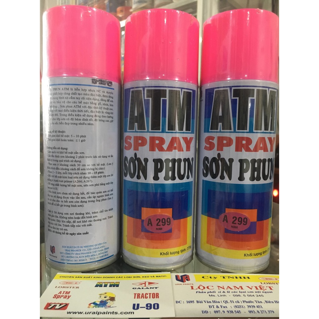 Sơn xịt màu hồng ATM A299SƠN XỊT ATM SPRAY Được Đặc chế từ hỗn hợp nhựa N/C và ACRYLIC, được đóng gói dưới dạng bình xịt cầm tay rất tiện dụng, dùng sơn để trang trí cho các bề mặt bằng gỗ và kim loại như: đồ gia dụng, bàn, ghế, đồ chơi trẻ em, xe đạp, xe máy,... Với đặc tính kỹ thuật cao, thích hợp với mọi điều kiện thời tiết, đặc biệt là vùng khí hậu nhiệt đới. Trong điều kiện sử dụng đúng theo hướng dẫn, sẽ cho lớp sơn có độ bám dính tốt, độ bóng cao, giữ được màu sắc bền đẹp trong nhiều năm. Đây là loại sơn mau khô, chất lượng tuyệt hảo với màu sắc tươi, bền và bóng đẹp đến không ngờ!