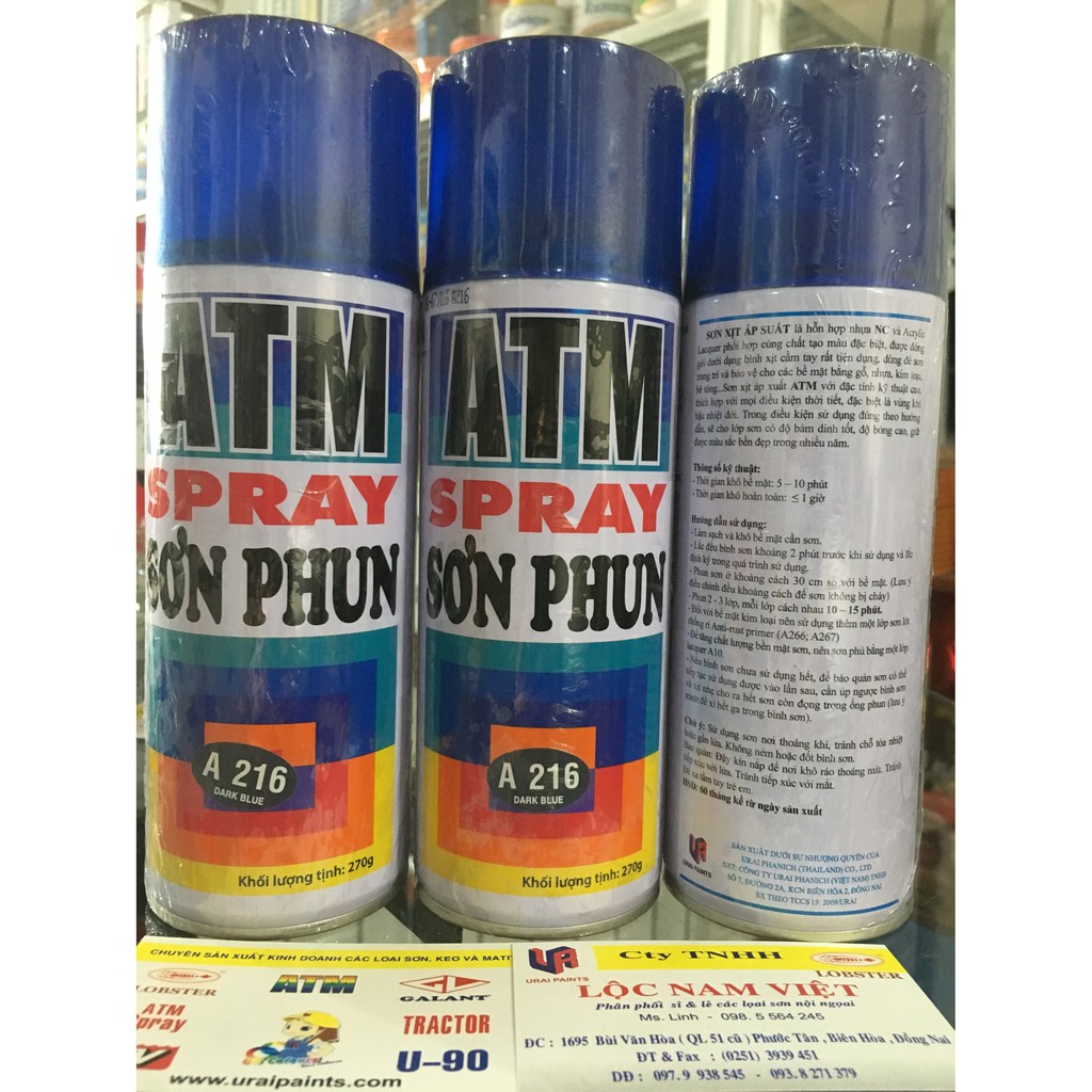 Sơn xịt màu xanh đen ATM A216SƠN XỊT ATM SPRAY Được Đặc chế từ hỗn hợp nhựa N/C và ACRYLIC, được đóng gói dưới dạng bình xịt cầm tay rất tiện dụng, dùng sơn để trang trí cho các bề mặt bằng gỗ và kim loại như: đồ gia dụng, bàn, ghế, đồ chơi trẻ em, xe đạp, xe máy,... Với đặc tính kỹ thuật cao, thích hợp với mọi điều kiện thời tiết, đặc biệt là vùng khí hậu nhiệt đới. Trong điều kiện sử dụng đúng theo hướng dẫn, sẽ cho lớp sơn có độ bám dính tốt, độ bóng cao, giữ được màu sắc bền đẹp trong nhiều năm. Đây là loại sơn mau khô, chất lượng tuyệt hảo với màu sắc tươi, bền và bóng đẹp đến không ngờ!