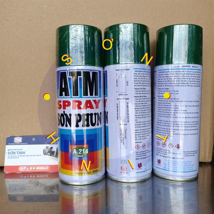 Sơn xịt màu xanh lá ATM A214SƠN XỊT ATM SPRAY Được Đặc chế từ hỗn hợp nhựa N/C và ACRYLIC, được đóng gói dưới dạng bình xịt cầm tay rất tiện dụng, dùng sơn để trang trí cho các bề mặt bằng gỗ và kim loại như: đồ gia dụng, bàn, ghế, đồ chơi trẻ em, xe đạp, xe máy,... Với đặc tính kỹ thuật cao, thích hợp với mọi điều kiện thời tiết, đặc biệt là vùng khí hậu nhiệt đới. Trong điều kiện sử dụng đúng theo hướng dẫn, sẽ cho lớp sơn có độ bám dính tốt, độ bóng cao, giữ được màu sắc bền đẹp trong nhiều năm. Đây là loại sơn mau khô, chất lượng tuyệt hảo với màu sắc tươi, bền và bóng đẹp đến không ngờ!