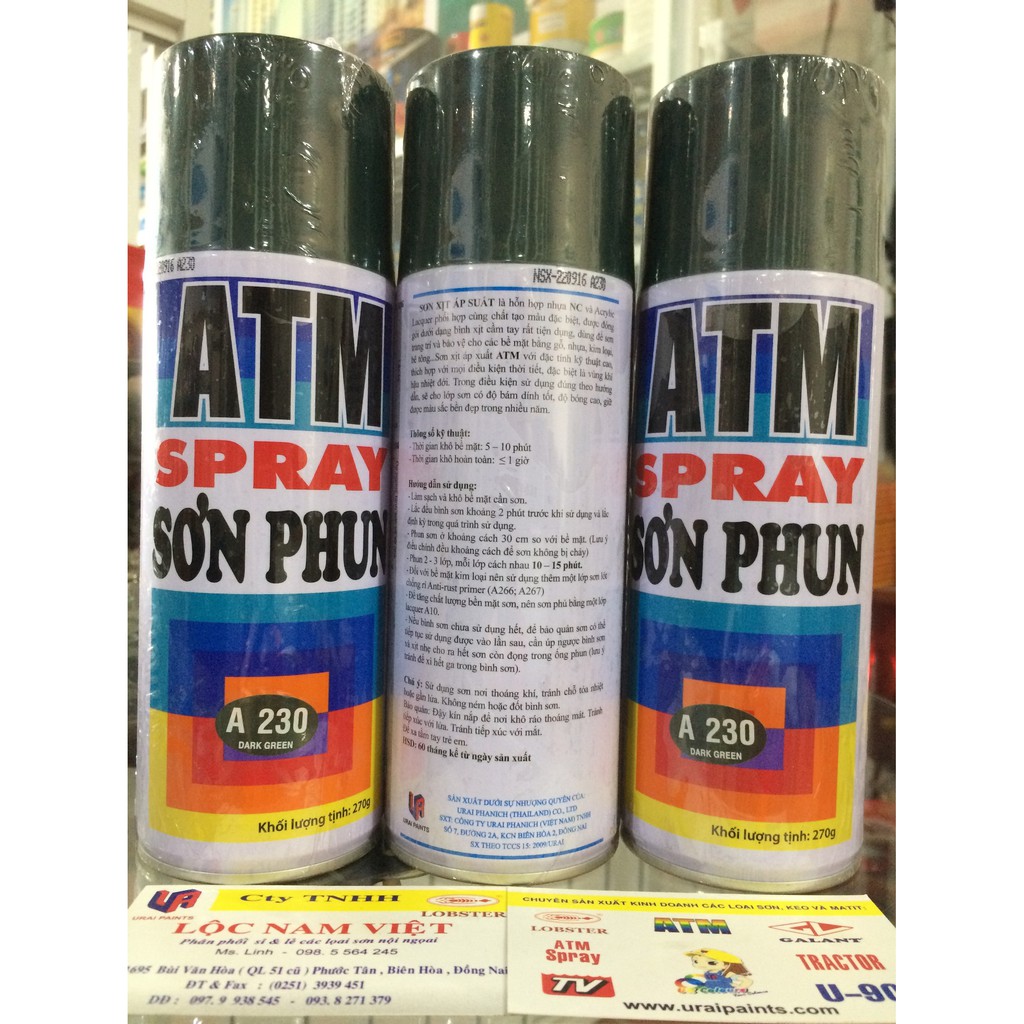 Sơn xịt màu xanh lá đậm ATM A230SƠN XỊT ATM SPRAY Được Đặc chế từ hỗn hợp nhựa N/C và ACRYLIC, được đóng gói dưới dạng bình xịt cầm tay rất tiện dụng, dùng sơn để trang trí cho các bề mặt bằng gỗ và kim loại như: đồ gia dụng, bàn, ghế, đồ chơi trẻ em, xe đạp, xe máy,... Với đặc tính kỹ thuật cao, thích hợp với mọi điều kiện thời tiết, đặc biệt là vùng khí hậu nhiệt đới. Trong điều kiện sử dụng đúng theo hướng dẫn, sẽ cho lớp sơn có độ bám dính tốt, độ bóng cao, giữ được màu sắc bền đẹp trong nhiều năm. Đây là loại sơn mau khô, chất lượng tuyệt hảo với màu sắc tươi, bền và bóng đẹp đến không ngờ!