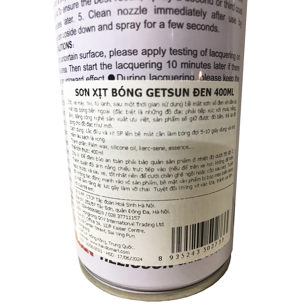 Thông tin sản phẩmTên sản phẩm : Sơn xịt nội ngoại thất siêu bóng & chịu nhiệt Getsun 400ml
