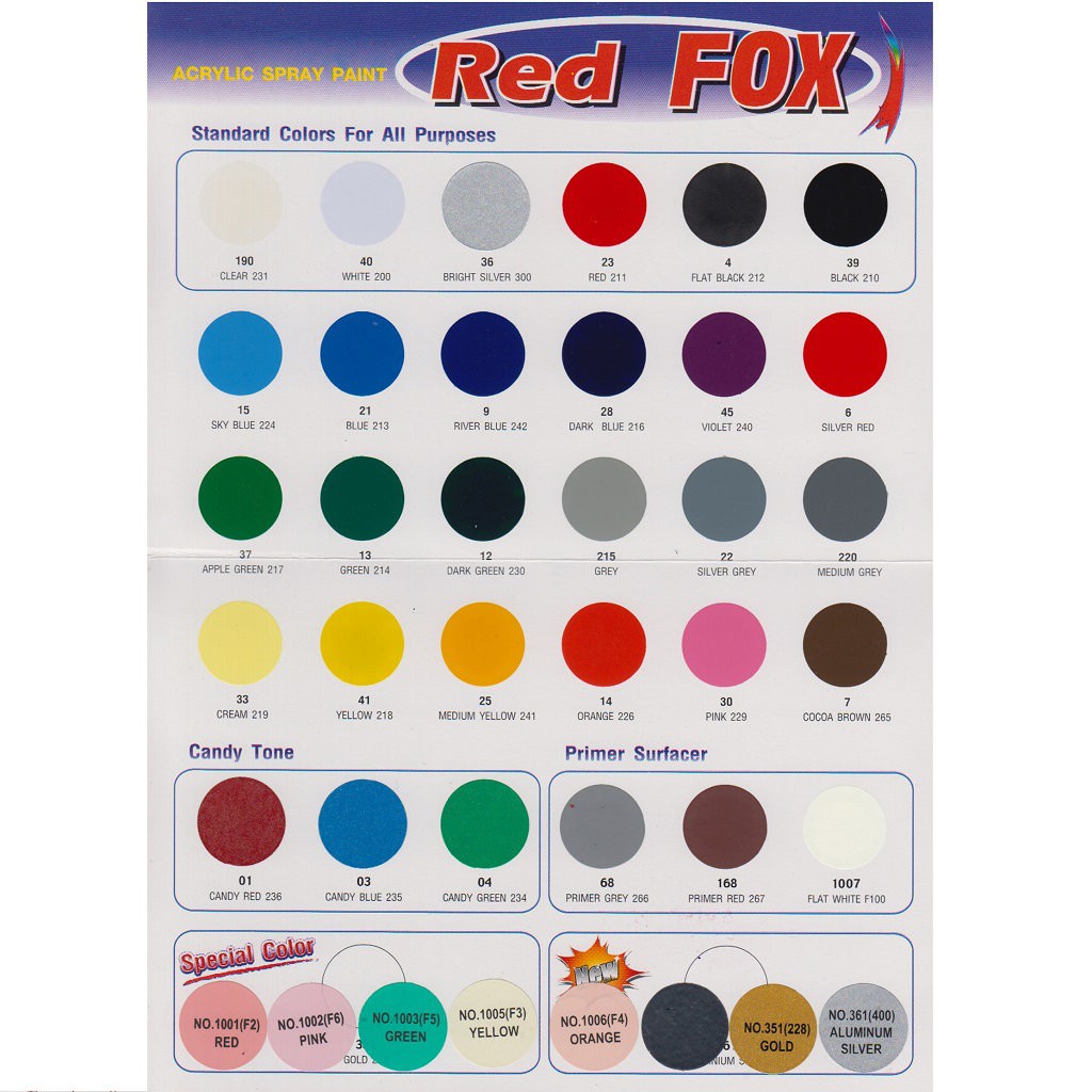 Sơn xịt Red Fox cũng là sản phẩm của RJ London Chemical Industry Co., Ltd, nhưng hướng đến các đối tượng khách hàng sử dụng phổ thông. Có độ bám khá tốt, chịu được nhiệt độ trung bình.Với công nghệ sản xuất đặc biệt, cho ra đời các sản phẩm có độ bám dính cao, lâu bền... Vì thế giá thành cũng tương xứng với chất lượng