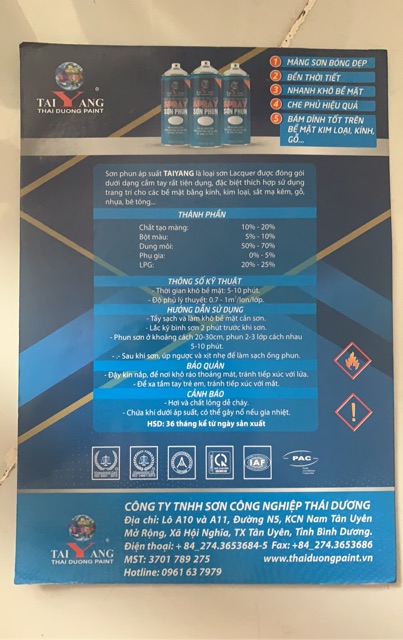 Nhà Cửa & Đời Sống > Dụng cụ & Thiết bị tiện ích > Sơn nhà cửa || Sơn xịt Taiyang dành cho bề mặt inox, gương, sắt mạ kẽm, nhựa, bê tông, gỗ - 1(không cần sơn lót)Còn hàng