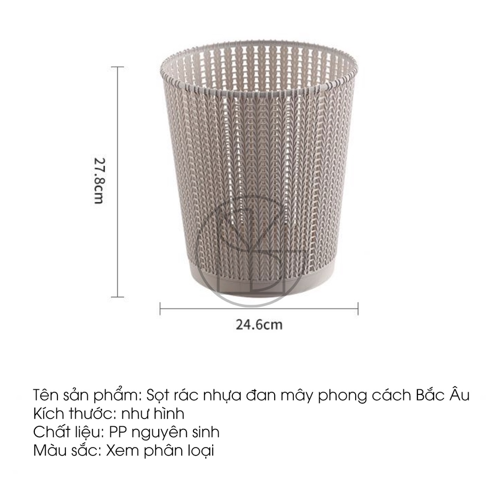 - Chất liệu nhựa PP cao cấp bền màu theo thời gian, hợp vệ sinh, an toàn khi sử dụng. Sọt rác nhựa tròn đan mây phong cách hàn quốc đựng đồ đa năng Việt Nhật nhỏ gọn, tiện lợi cho việc vận chuyển và giúp cho việc vệ sinh được thực hiện dễ dàng hơn Thiết kế không nắp, kiểu dáng đan mây sang trọng và cách điệu, màu sắc trang nhã thân thiện với môi trường.