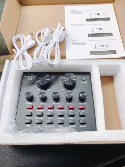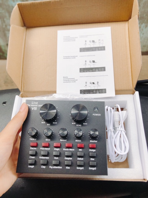 Sound card thu âm V8 là sản phẩm card âm thanh tương thích với nhiều thiết bị như smartphone, laptop, pc, máy tính bảng. Với tính năng làm méo giọng hát, thành giọng trẻ em, người già, Khả năng chèn các hiệu ứng âm thanh vào các đoạn thu như tiếng vỗ tay, tiếng hò reo, nhạc cổ vũ, tiếng chim kêu... với 12 hiệu ứng âm thanh, sẽ đem lại cho bạn trải nghiệm thu âm vô cùng thú vị.