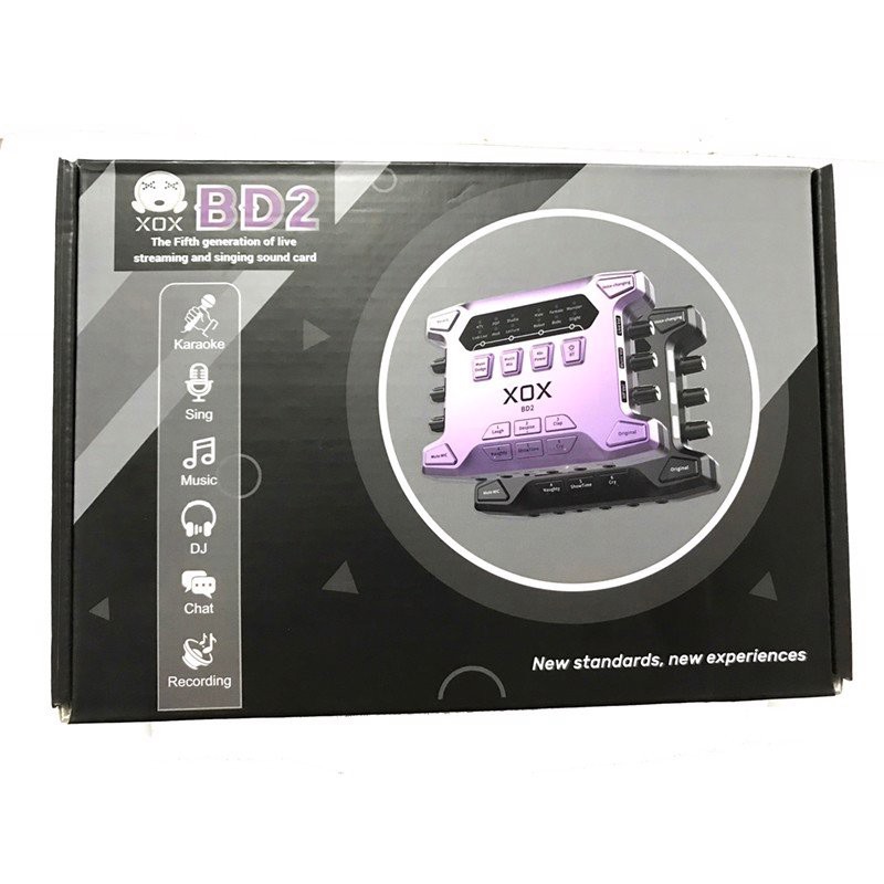 Sound card XOX BD2 phiên bản nâng cấp của sound card XOX K108X với nhiều tính năng mới như hỗ trợ lấy nhạc qua bluetooth, tích hợp nguồn 48v, các hiệu ứng giả giọng trẻ con, ông già, robot... tiếng cười cổ vũ vỗ tay... đặc biệt chế độ vang vọng mượt mà chế độ chống tạp âm tiếng ồn tốt rất phù hợp cho nhu cầu hát online, livestream.