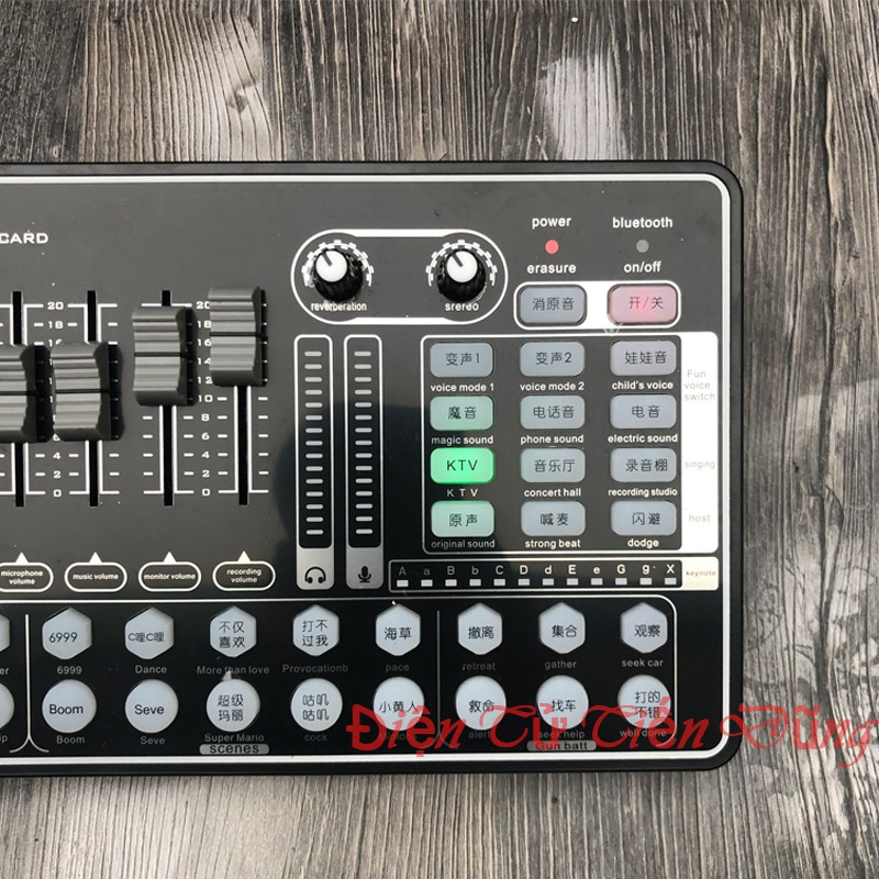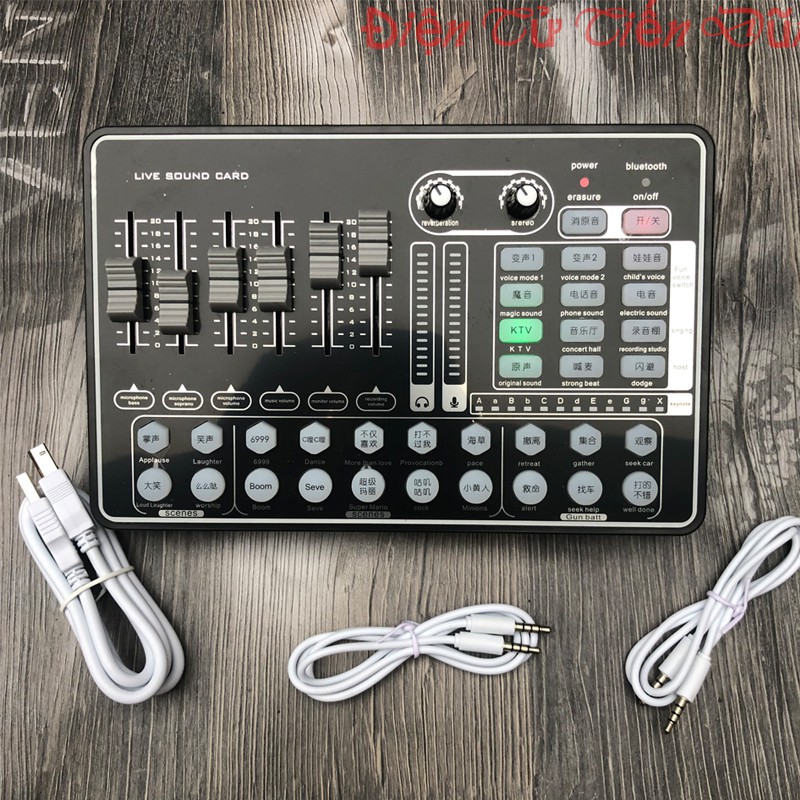 - Soundcard thu âm H9 Bluetooth được tích hợp thêm 6 phím điều chỉnh dạng trượt và 2 núm vặn xoay , để giúp người dùng có thể tự động điều chỉnh tỉnh chỉnh được nhữngg âm thanh đầu vào như các dải âm bass , treble , hay đồ vang âm lượng mic hay âm lượng tai nghe cho ra , quá tiện lợi và dễ dàng sử dụng