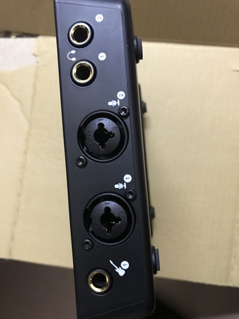 - Hai cổng mic in combo 2 cổng giao tiếp XLR (48V)và 6.3mm (5V) với 2 núm điều chỉnh Gain riêng biệt.