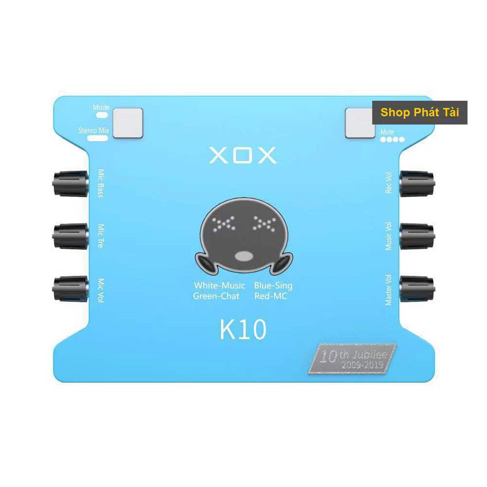 Soundcard Livestream XOX K10 10th phiên bản Tiếng Anh sự nâng cấp hoàn hảo đánh dấu 10 năm ra đời và thanh công của Soundcard livestream XOX K10. Trước đó hãng đã tung ra thị trường dòng sản phẩm là Sound Card XOX KS108 đã rất thành công và được sự đón nhận của người dùng. Để kỷ niệm 10 thanh lập ra mẫu XOX K10 hãng quyết định nâng cấp, cải tiến XOX K10 10th bản Quốc Tế đánh dấu bước gặt thành công và mở ra thị trường tiêu dùng trong nước và quốc tế một sản phẩm thu âm, livestream chất lượng.Tích hợp dây livestream theo sản phẩm.