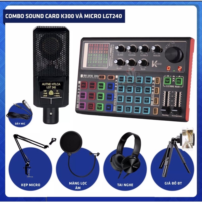 Bộ Sound Card K300 Auto Tun Mới Nhất Và Mic LGT240 Kèm Đầy Đủ Phụ Kiện Tặng Tai Ốp Bh 12 tháng