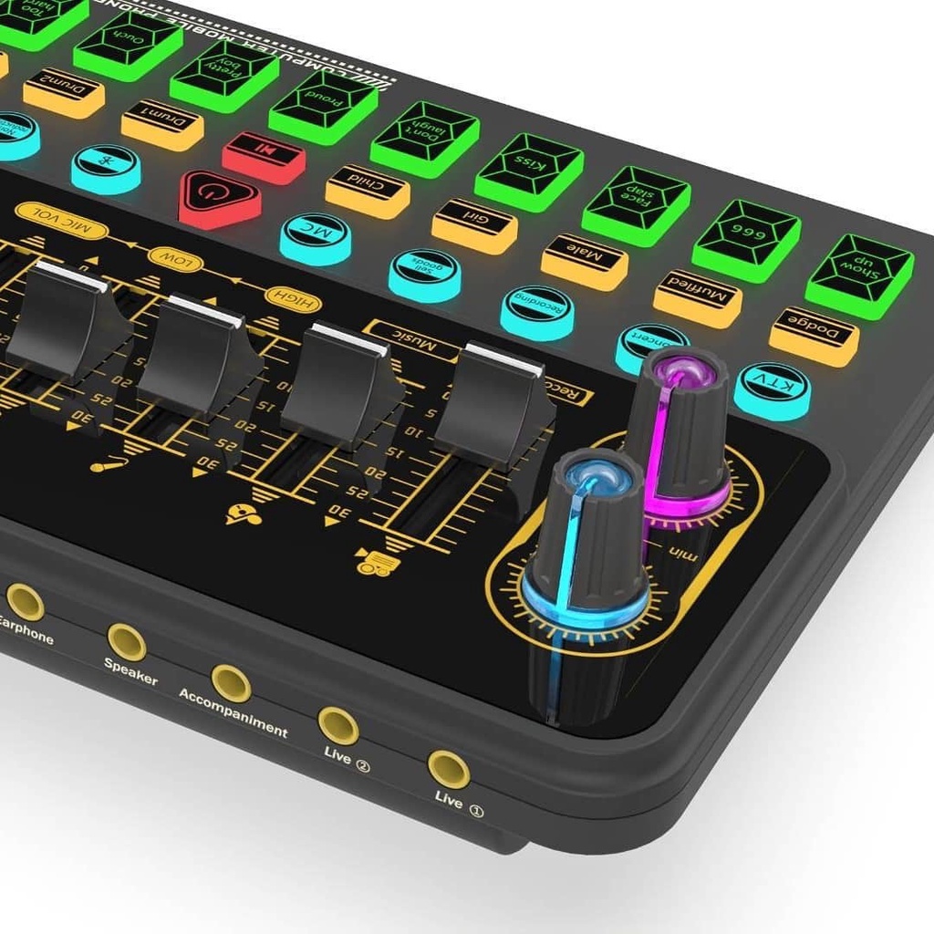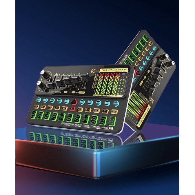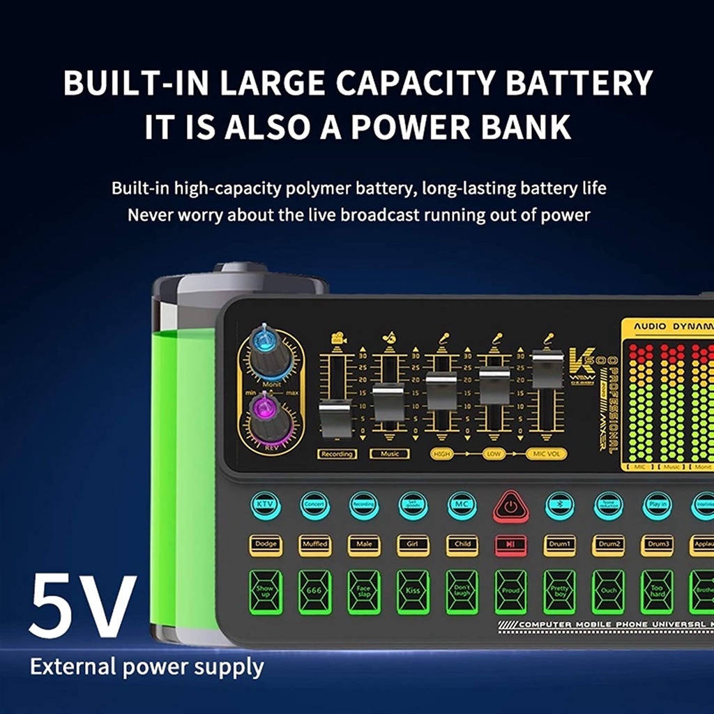 - Sound Card này được tích hợp chip kỹ thuật số DSP lõi kép có thể chuyển đổi nhiều chế độ, hỗ trợ micro kép, phát sóng trực tiếp kép, tai nghe kép.