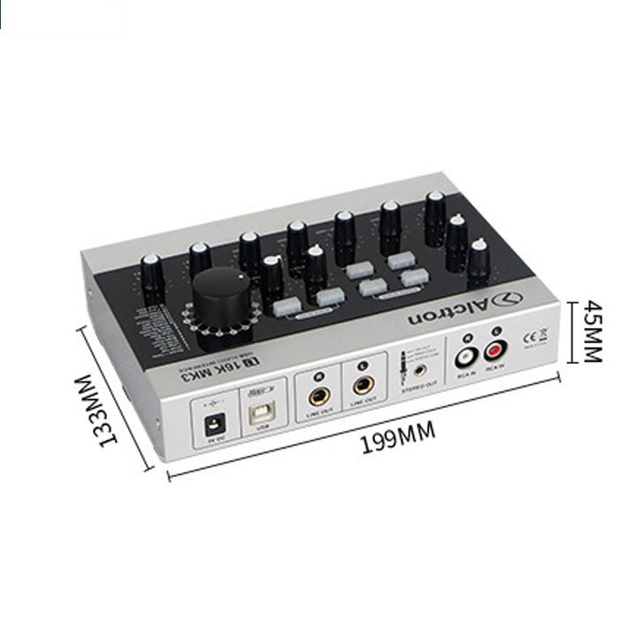 Sound card Alctron U16K MKIII USB được thiết kế cải thiện đẹp mắt hơn, trau chuốt trong từng chi tiết, kích thước nhỏ gọn 199mm x 133mm x 45mm. Vỏ ngoài được làm 100% từ hợp kim nhôm và kính càng tạo lên độ bóng bảy của Alctron U16K MKIII, chi tiết từ bên trong đến bên ngoài đều thể hiện được sự đẳng cấp và sang trọng. Các nút điều khiển và núm điều khiểu được thiết kế trên mặt trước của Sound card có đèn LED đẹp hơn và dễ dàng sử dụng vào ban đêm, hướng dẫn bằng tiếng anh trước các nút điều khiểu cho người mới dùng cũng có thể sử dụng được.