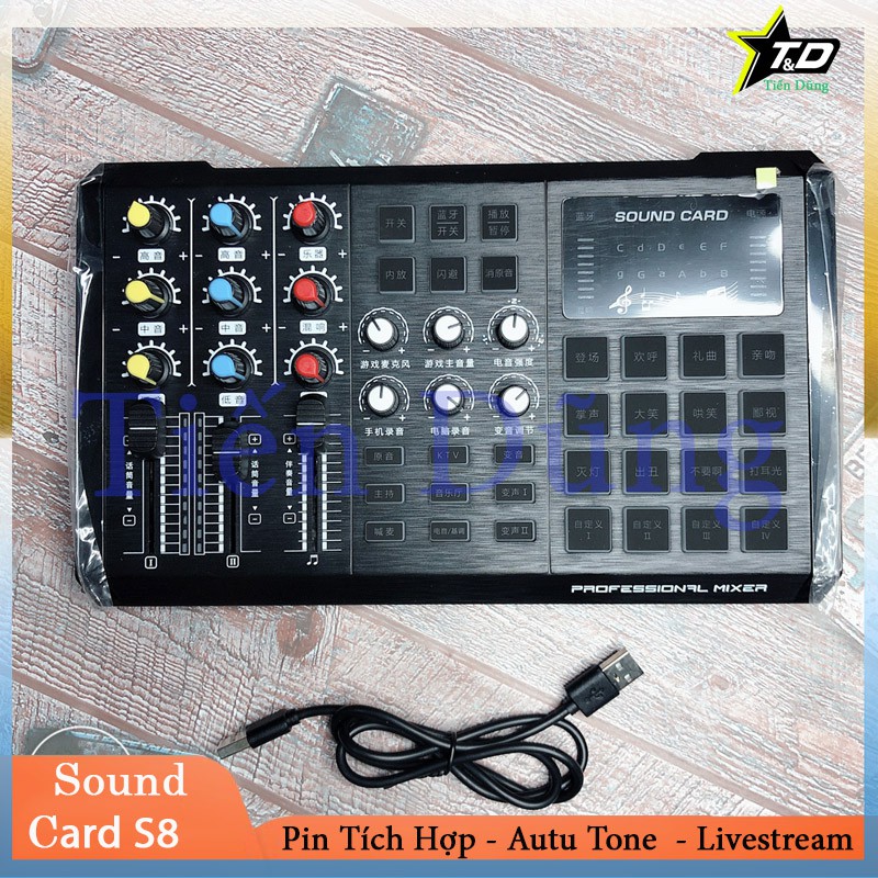 Sound card S8phiên bản tiếng anh có sự cải tiến vượt trội hơn hẳn so với các dòng Sound card chuyên dụng như v10.h9.k10 .....dùng để hát karaoke, hát livestream qua mạng xã hội hoặc được trang bị cho phòngthu âm chuyên nghiệp với chất lượng âm thanh tốt hơn.Ngoài ra sound cardhỗ trợ đầy đủ các tính năng nổi bật như hiệu chỉnh Auto-Tune, giả giọng, nhái giọng người già, trẻ em… Đặc biệt S8 còn trang bịkết nối Bluetooth không dây dễdàng với điện thoại phát nhạc karaoke giúp cho việc thao tác chọn bài hát tiện lợihơn dù ở khoảng cách xa.