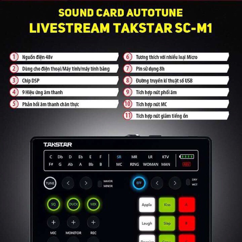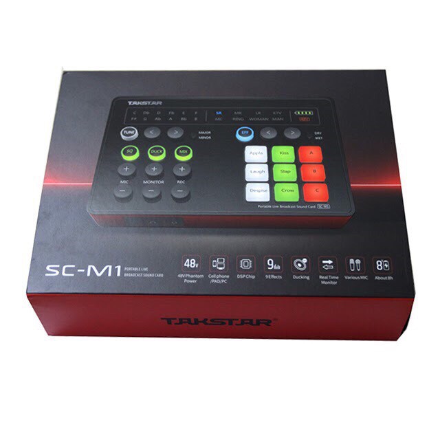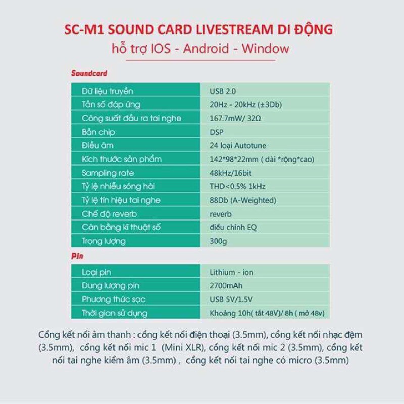 SC- M1 là một loại sound card âm thanh di động được thiết kế cho hát karaoke và livestream. No tương thích với điên thoại thông minh, máy tính bẳng và máy tính. Hệ thống ISO, Android, Windown. tích hợp chip kĩ thuật số DSP, hoạt động chỉ bằng một nút bấm, với nhiều hiệu ứng âm thanh đặc sắc, giúp việc phát sóng trực tiếp trở nên đơn giản , dễ hiểu.