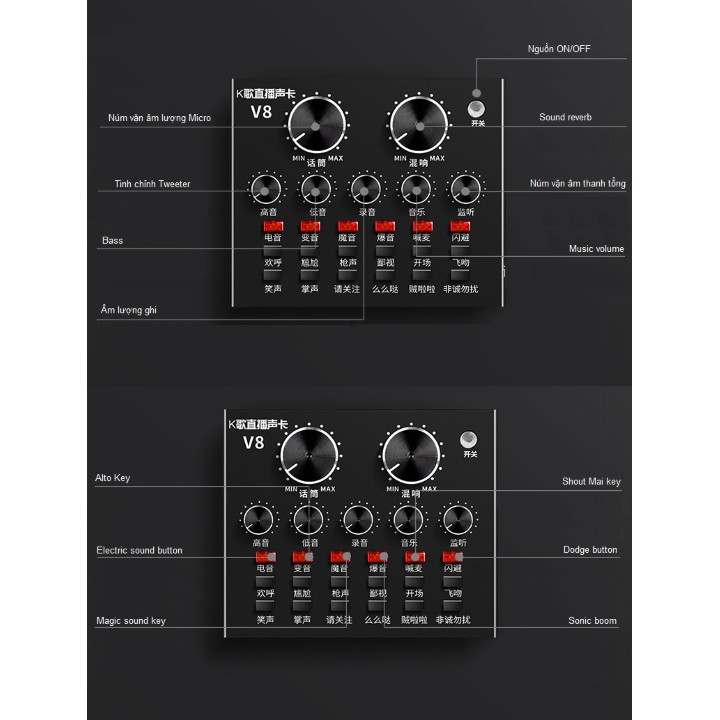 SẢN PHẨM TƯƠNG THÍCH VỚI NHIỀU THIẾT BỊ NHƯ SMARTPHONE, LAPTOP, PC, MÁY TÍNH BẢNG, V.V. NGOÀI CÁC TÍNH NĂNG ĐIỀU CHỈNH THÔNG DỤNG NHƯ TẤT CẢ CÁC DÒNG SOURCARD PHÒNG THU KHÁC, SOUND CARD THU ÂM V8 CÒN ĐƯỢC TRANG BỊ 12 HIỆU ỨNG ÂM THANH PHỤ, RẤT THÍCH HỢP CHO VIỆC THU ÂM HAY LỒNG TIẾNG CHO CÁC VIDEO NHƯ LÀM MÉO GIỌNG HÁT TRỞ THÀNH GIỌNG TRẺ EM, NGƯỜI GIÀ, KHẢ NĂNG CHÈN CÁC HIỆU ỨNG ÂM THANH VÀO CÁC ĐOẠN THU NHƯ TIẾNG VỖ TAY, TIẾNG HÒ REO, NHẠC CỔ VŨ, TIẾNG CHIM KÊU, V.V. SẼ MANG LẠI CHO BẠN TRẢI NGHIỆM THU ÂM VÔ CÙNG ẤN TƯỢNG VÀ THÚ VỊ.