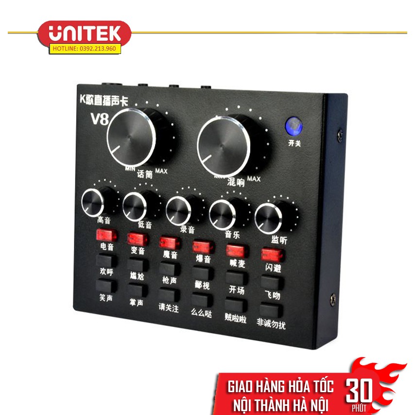 Sound card hiểu nôm na là “Card” Âm Thanh tức là thiết bị dùng để thu nhận, xử lý và phát tín hiệu âm thanh thông qua 1 thiết bị ngoại vi khác. Âm thanh trong máy tính là ở dạng digital (kỹ thuật số) muốn truyền tốt được ra ngoài cần có một thiết bị chuyển digital qua analog (tín hiệu băng tần) vậy nên Sound card thu âm V8 giúp máy bạn thực hiện điều đó.card thu âm V8 là sản phẩm card âm thanh tương thích với nhiều thiết bị như smartphone, laptop, pc, máy tính bảng. Với tính năng làm méo giọng hát, thành giọng trẻ em, người già, Khả năng chèn các hiệu ứng âm thanh vào các đoạn thu như tiếng vỗ tay, tiếng hò reo, nhạc cổ vũ, tiếng chim kêu... với 12 hiệu ứng âm thanh, sẽ đem lại cho bạn trải nghiệm thu âm vô cùng thú vị.