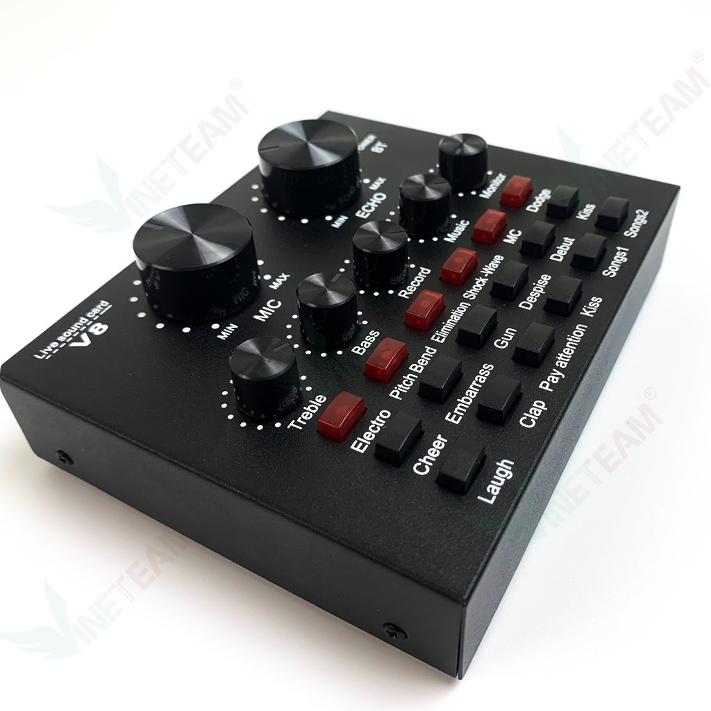 Sound card thu âm V8 là sản phẩm card âm thanh tương thích với nhiều thiết bị như smartphone, laptop, pc, máy tính bảng. Với tính năng làm méo giọng hát, thành giọng trẻ em, người già, Khả năng chèn các hiệu ứng âm thanh vào các đoạn thu như tiếng vỗ tay, tiếng hò reo, nhạc cổ vũ, tiếng chim kêu... với 12 hiệu ứng âm thanh, sẽ đem lại cho bạn trải nghiệm thu âm vô cùng thú vị.