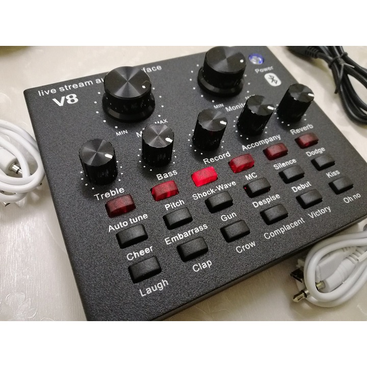 Card V8 bluetooth có sự chuyển đổi tín hiệu tối tái tại âm thanh mạnh mẽ có đầy đủ hầu hết chức năng của những sound card V8, K10, V10 hiện nay.