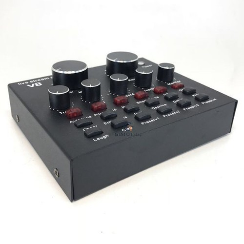 Sound card thu âm V8 là sản phẩm card âm thanh tương thích với nhiều thiết bị như smartphone, laptop, pc, máy tính bảng. Với tính năng làm méo giọng hát, thành giọng trẻ em, người già, Khả năng chèn các hiệu ứng âm thanh vào các đoạn thu như tiếng vỗ tay, tiếng hò reo, nhạc cổ vũ, tiếng chim kêu... với 12 hiệu ứng âm thanh, sẽ đem lại cho bạn trải nghiệm thu âm vô cùng thú vị.