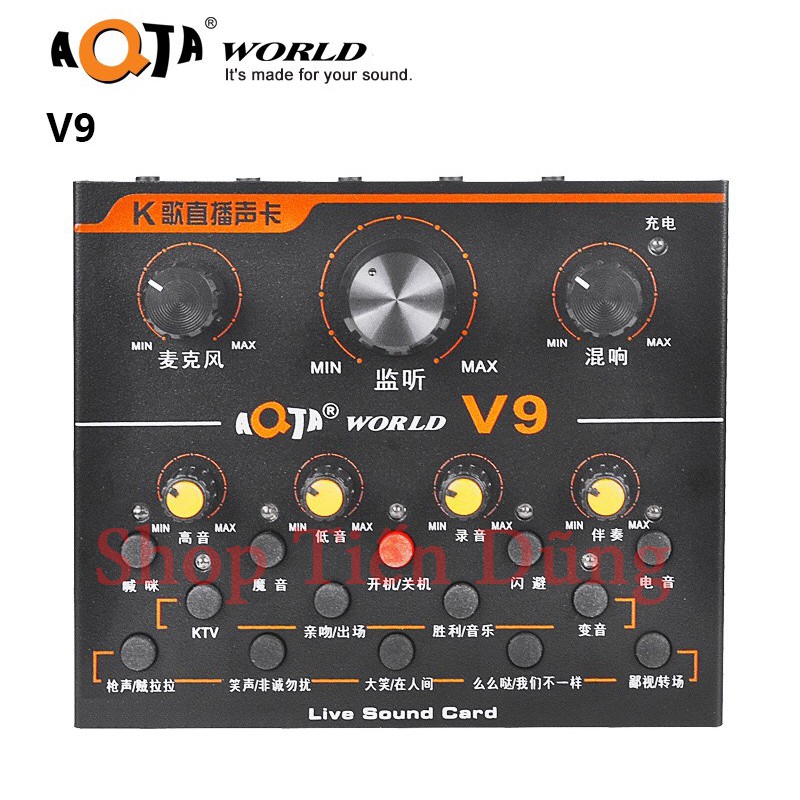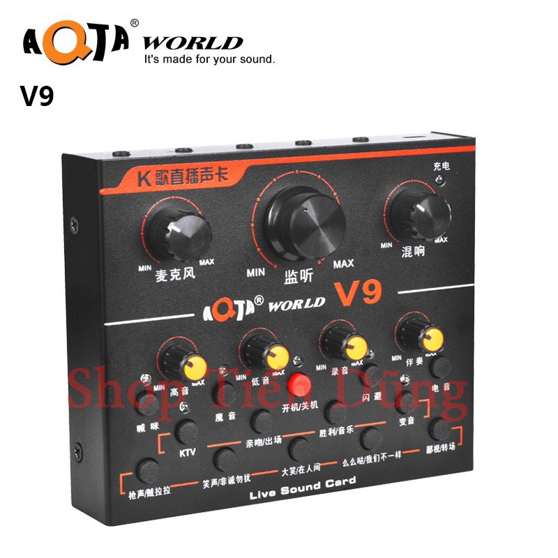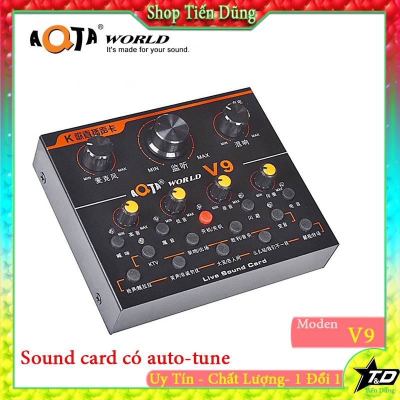 - Sound card thu âm V9 là sản phẩm card âm thanh chuyên dùng cho hát live stream, hát karaoke, thu âm tại nhà. Sound Card V9 AQTA tương thích với nhiều thiết bị như điện thoại smartphone, máy tính bảng, laptop, PC. Sound card V9 hỗ trợ 12 hiệu ứng âm thanh sống động, đi kèm là rất nhiều tinh chỉnh âm thanh đầu vào, giúp công việc hát karaoke cá nhân hay thu âm của bạn trở nên dễ dàng hơn.