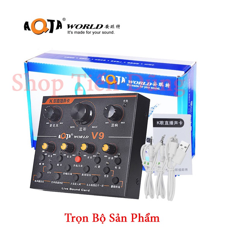 – Nguyên hộp Sound Card V9 AQTA đã có đầy đủ dây kết nối (dây 3,5 lấy nhạc, dây live stream, dây sạc)