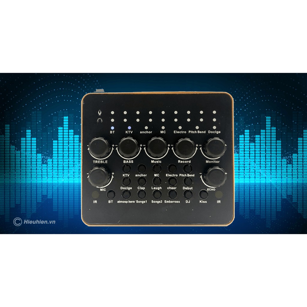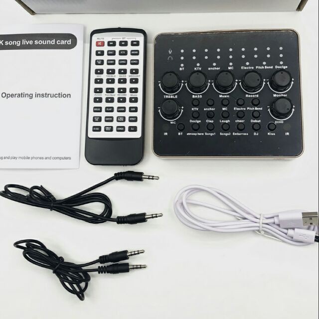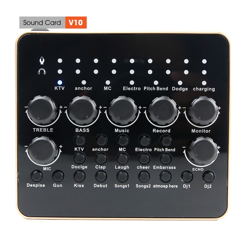 - Sound card v10 là một dòng sound card chuyên dùng để thu âm, hát karaoke giải trí, hát livestream trên các trang mạng xã hội: Facebook, youtube, bigo… Mặc dù mới có mặt trên thị trường một thời gian nhưng sound card v10 đã được rất nhiều các tín đồ yêu âm nhạc ở trên toàn quốc tin dùng.- Cũng như những dòng sound card thu âm chuyên dụng khác, sound card v10 cũng có các nút chỉnh bass (làm ấm giọng), treble (làm sáng giọng), echo (thêm vang cho giọng) và các nút điều chỉnh âm lượng micro, âm lượng nhạc beat, âm lượng tai nghe.