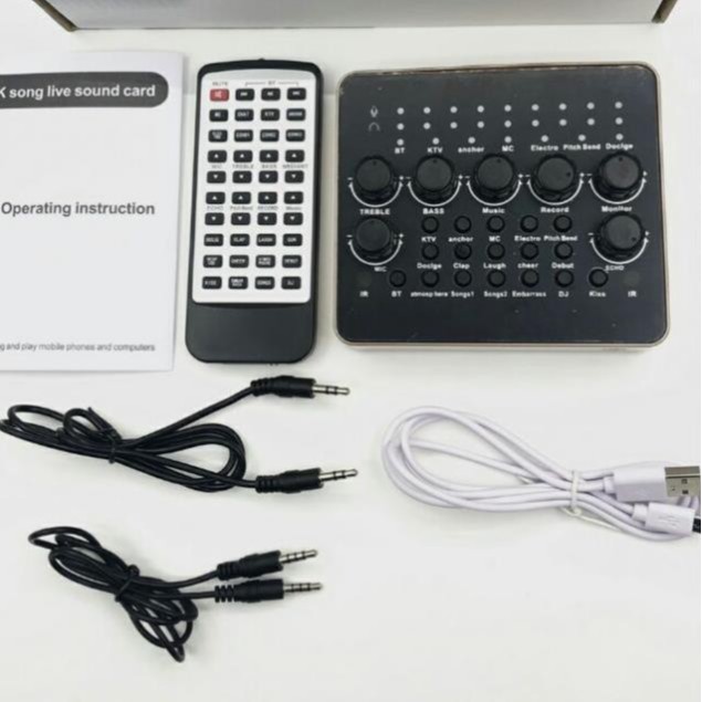 - Sound card v10 là một dòng sound card chuyên dùng để thu âm, hát karaoke giải trí, hát livestream trên các trang mạng xã hội: Facebook, youtube, bigo… Mặc dù mới có mặt trên thị trường một thời gian nhưng sound card v10 đã được rất nhiều các tín đồ yêu âm nhạc ở trên toàn quốc tin dùng.- Cũng như những dòng sound card thu âm chuyên dụng khác, sound card v10 cũng có các nút chỉnh bass (làm ấm giọng), treble (làm sáng giọng), echo (thêm vang cho giọng) và các nút điều chỉnh âm lượng micro, âm lượng nhạc beat, âm lượng tai nghe.