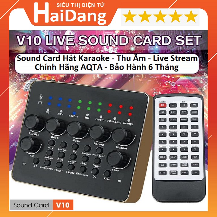 - Sound card v10 là một dòng sound card chuyên dùng để thu âm, hát karaoke giải trí, hát livestream trên các trang mạng xã hội: Facebook, youtube, bigo… Mặc dù mới có mặt trên thị trường một thời gian nhưng sound card v10 đã được rất nhiều các tín đồ yêu âm nhạc ở trên toàn quốc tin dùng.- Cũng như những dòng sound card thu âm chuyên dụng khác, sound card v10 cũng có các nút chỉnh bass (làm ấm giọng), treble (làm sáng giọng), echo (thêm vang cho giọng) và các nút điều chỉnh âm lượng micro, âm lượng nhạc beat, âm lượng tai nghe.