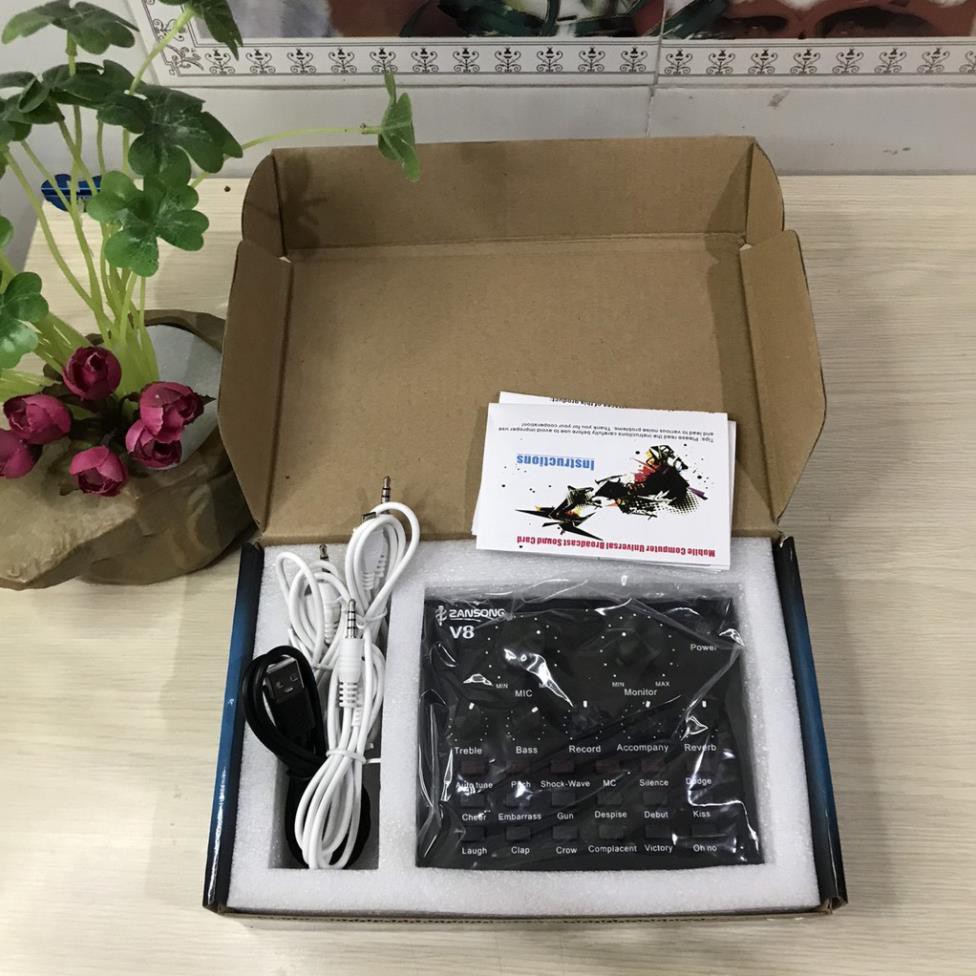 Sound card thu âm V8 là sản phẩm card âm thanh tương thích với nhiều thiết bị như smartphone, laptop, pc, máy tính bảng. Với tính năng làm méo giọng hát, thành giọng trẻ em, người già, Khả năng chèn các hiệu ứng âm thanh vào các đoạn thu như tiếng vỗ tay, tiếng hò reo, nhạc cổ vũ, tiếng chim kêu... với 12 hiệu ứng âm thanh, sẽ đem lại cho bạn trải nghiệm thu âm vô cùng thú vị.