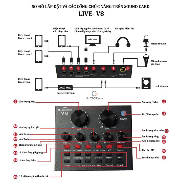 Bước 5: Kết nối điện thoại với Sound Card V8 để LiveStream, karaoke online