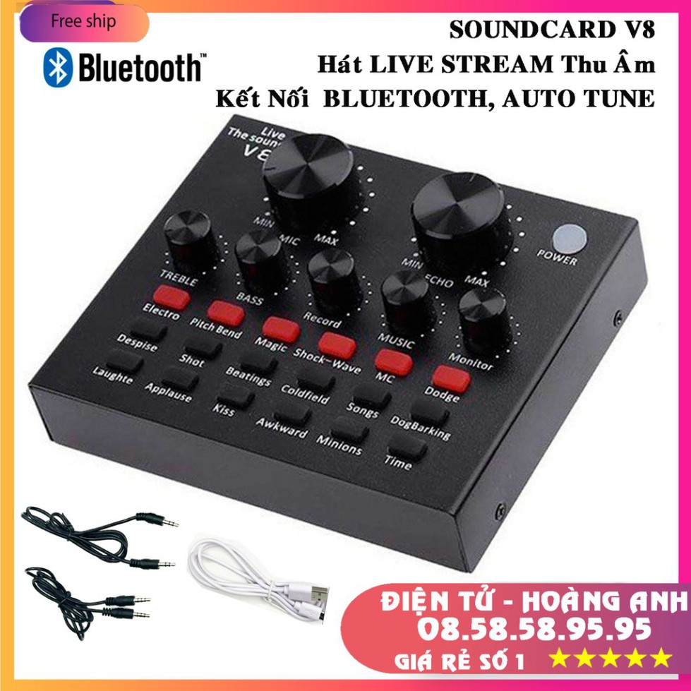Sound card V8 có BLUETOOTH auto tune live livestream loại 1 (Mic AT100-BM 900-AQ220-S8-V8-V9-V10)