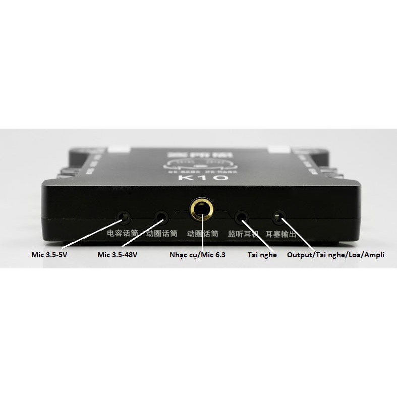 * Các cổng kết nối micro đặt ngay mặt dưới, K10 hỗ trợ kết nối 2 micro cùng lúc để hát song ca hay thu âm phối đôi. Một điểm nổi bật mà chỉ có trên các dòng sound card đắt tiền.