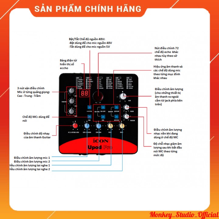 - Sound card USB ICON Upod Pro tối ưu âm thanh chất lượng cao 16bit/48kHz, cung cấp 72 hiệu ứng âm thanh kỹ thuật số, phục vụ tốt cho nhu cầu thu âm online, hát karaoke trên máy tính hay hát