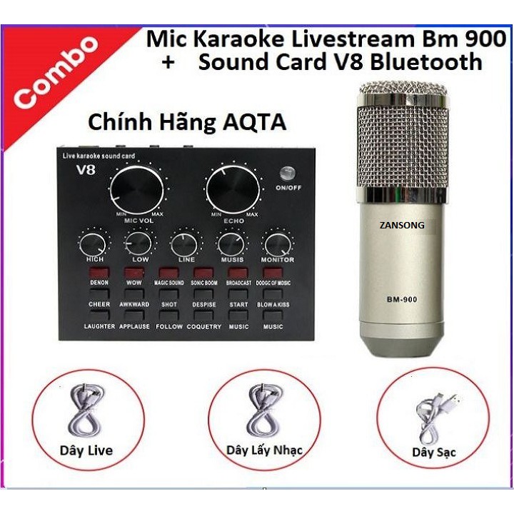 Combo Soundcard V8 AQTA Chính Hãng Bluetooth + Mic Karaoke Livetream BM 900, Có AutoTuneShop Có Tặng tai Nghe Chuẩn Phòng Thu XB-450