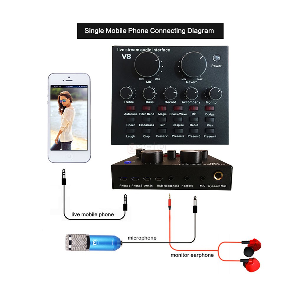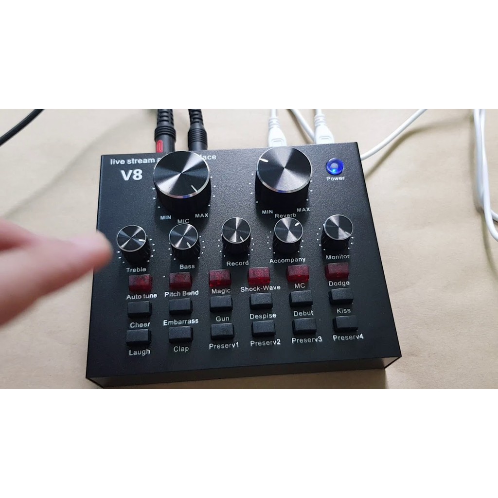 Sound card thu âm V8 là sản phẩm card âm thanh tương thích với nhiều thiết bị như smartphone, laptop, pc, máy tính bảng. Với tính năng làm méo giọng hát, thành giọng trẻ em, người già, Khả năng chèn các hiệu ứng âm thanh vào các đoạn thu như tiếng vỗ tay, tiếng hò reo, nhạc cổ vũ, tiếng chim kêu... với 12 hiệu ứng âm thanh, sẽ đem lại cho bạn trải nghiệm thu âm vô cùng thú vị.