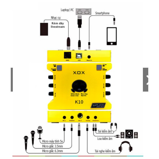 - Đặc biệt kèm sẵn dây livestream theo XOX K10 và dây lấy nhạc. Có thể PK nói chuyện qua lại khi livestream được mà không cần dùng đến dây livestream khác.