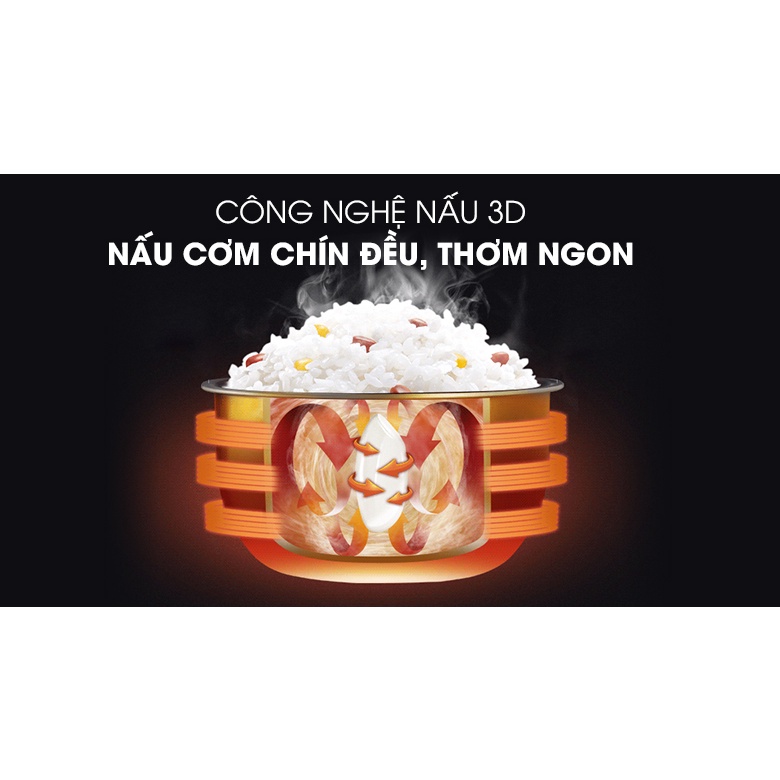 - Nồi cơm dùng công nghệ nấu 3D, giúp cơm nấu mau chín, hạn chế cơm nhão, tiết kiệm thời gian