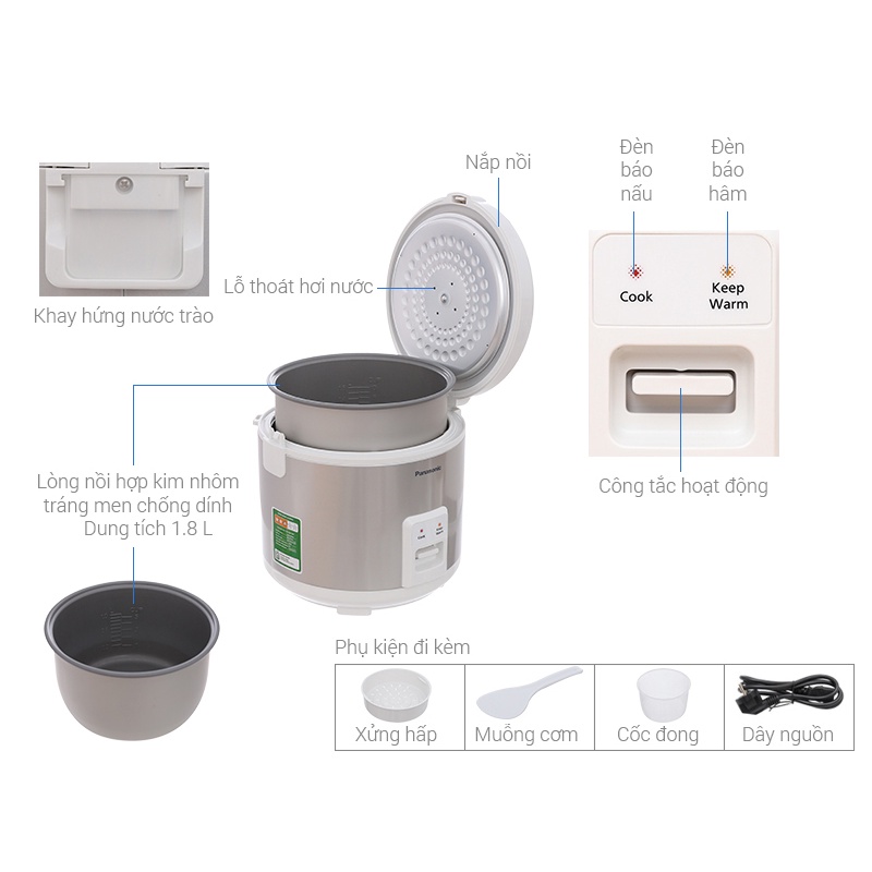 - Nồi cơm nắp gài dung tích 1.8 lít phục vụ tốt cho các gia đình 4 - 6 thành viên