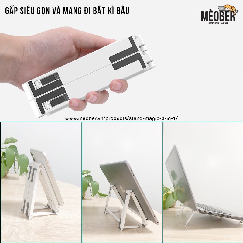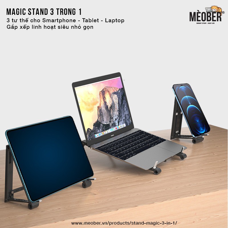 Stand Magic 3-in-1 - Giá đỡ thần kí với khả năng xếp nhỏ gọn, linh hoạt dùng 3-in-1 Laptop/Smartphone/Tablet mọi lúc mọi nơi. Tạo góc nghiêng tối ưu cho sử dụng, làm việc.Stand Magic 3-in-1 - Giá đỡ laptop, điện thoại, máy tính bảng, nhỏ gọn gắp xếp linh hoạt được hoàn thiện từ nhựa ABS khối và gia cố khớp nhôm với thiết kế trục xoay có thể dễ dàng điều chỉnh các chế độ linh hoạt giữ kê laptop, kê điện thoại hay kê máy tính bảng. Thiết kế tổng thể tối giản của Stand Magic sẽ mang đến cho không gian làm việc/học tập của bạn sự tinh tế và tăng cảm hứng, gắp xếp gọn gàng còn giúp bạn mang stand theo để sử dụng dù ở bất kì đâu.