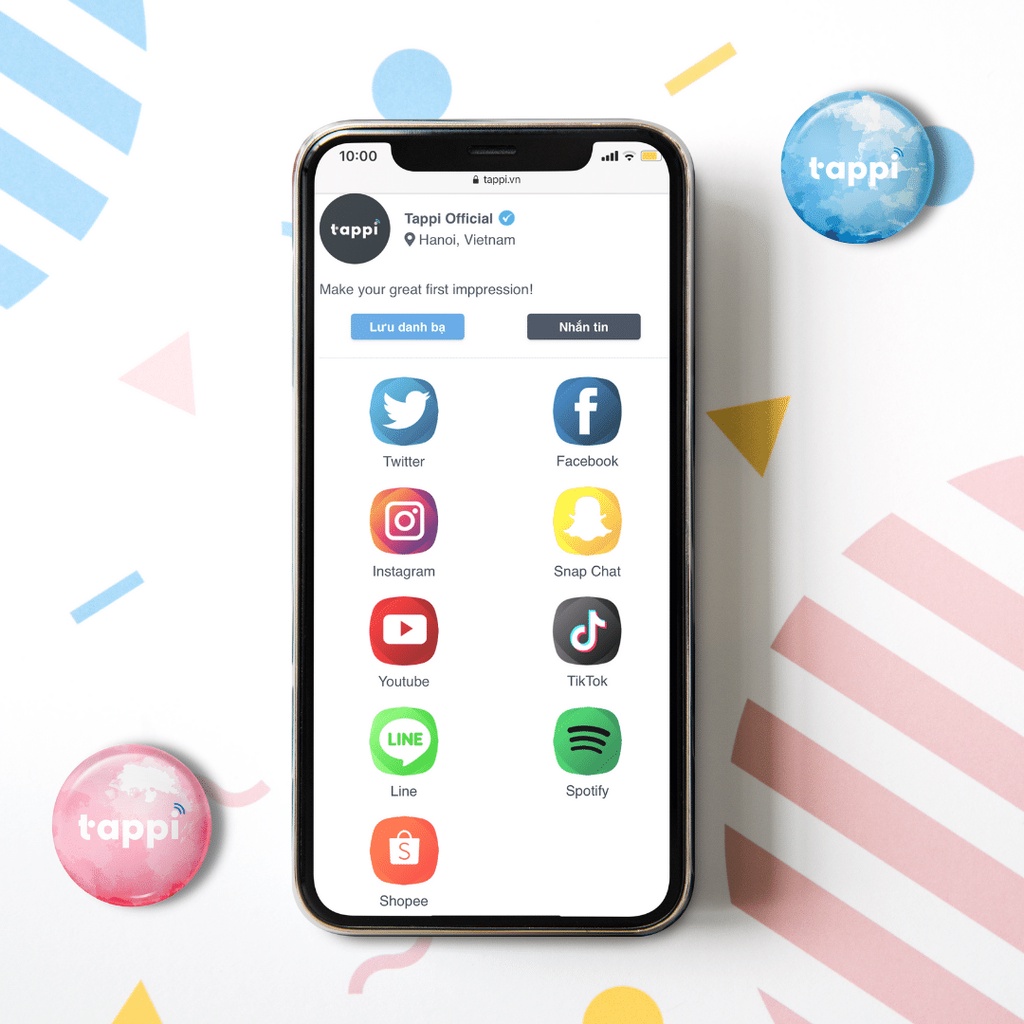 Tappi là sản phẩm công nghệ hàng đầu tại Việt Nam dùng để chia sẻ các trang mạng xã hội và thông tin liên lạc cá nhân một cách nhanh chóng và hiệu quả nhất chỉ với 1 lần CHẠM