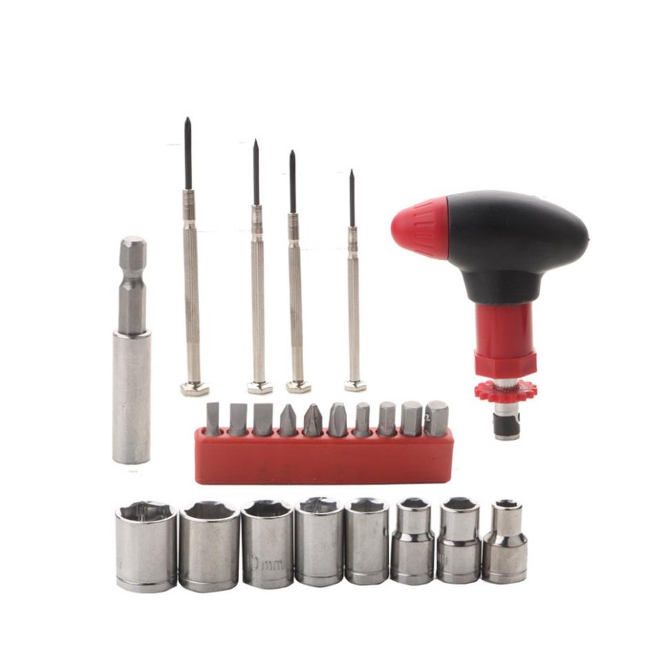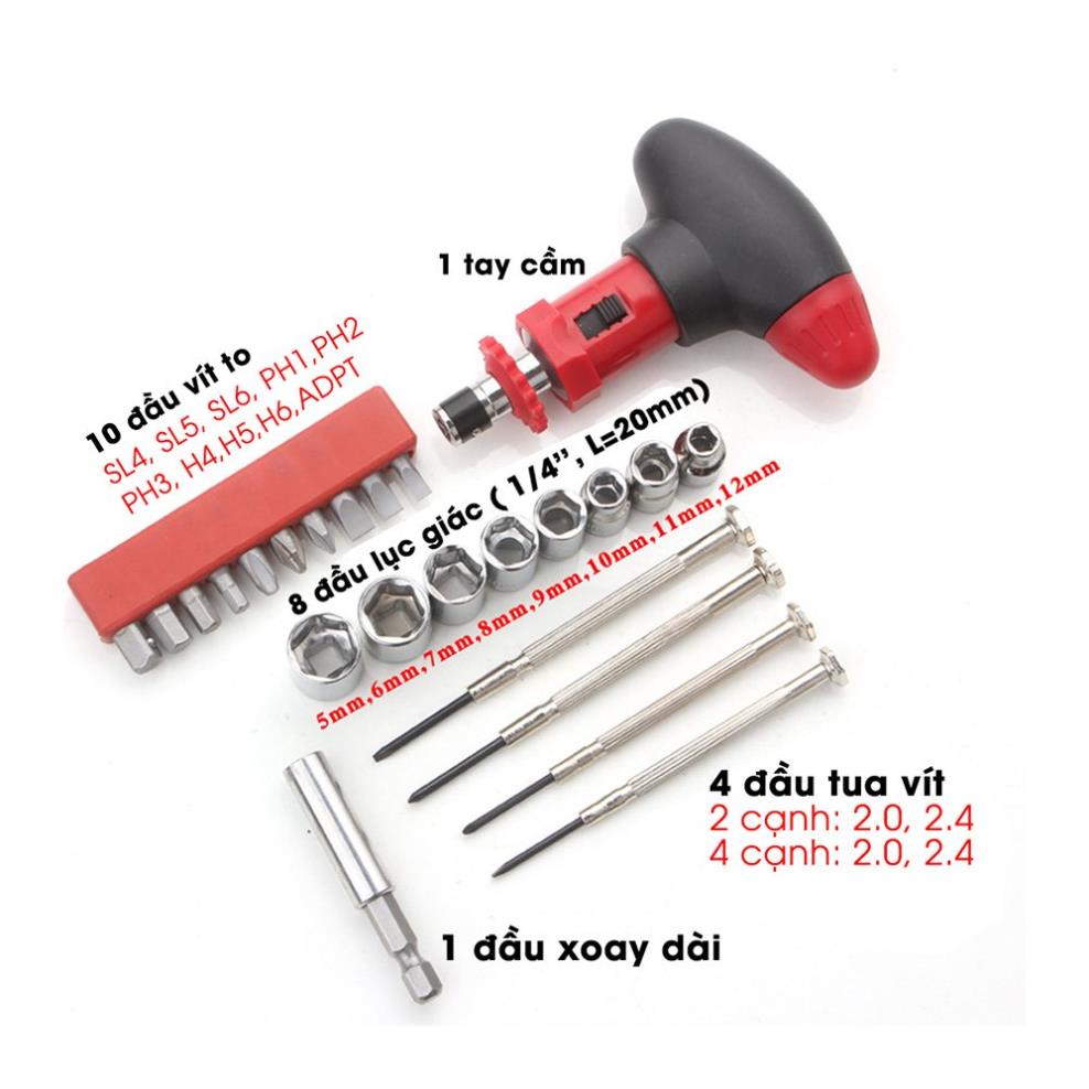 - Bộ dụng cụ sửa chưa gồm 24 chi tiết , cụ thể 10 đầu xiay vít to, 8 đầu xoay lục giác, 2 đầu vít nhỏ dài 2 cạnh, 2 đầu vít nhỏ dài 4 cạnh. Rất thích hợp để sửa chữa các đồ vật trong gia đình.