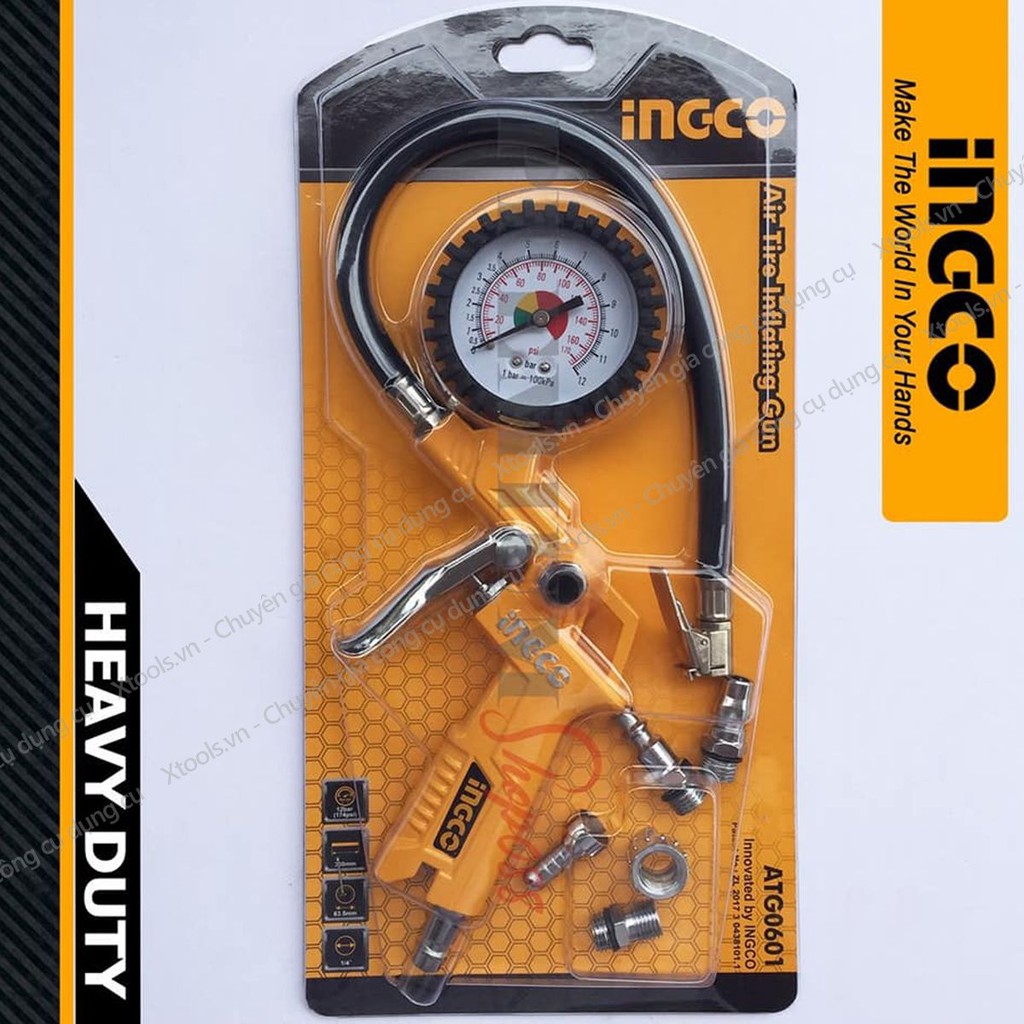 Súng bơm hơi tích hợp đồng hồ đo áp suất khí INGCO ATG0601 12bar bơm nén khí lốp xe đạp xe máy xe hơi hồ bơi nệm hơi